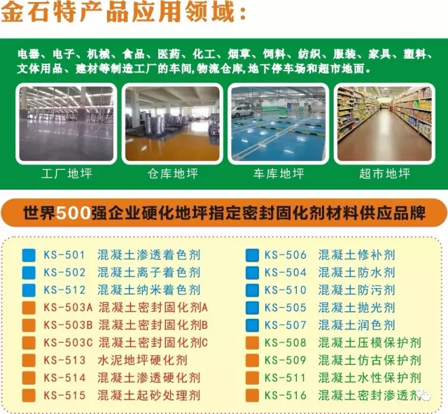 世界500强企业,指定材料供应商,金石特地面起砂处理剂备受新老客户喜爱,有理由,公司一直以“金石品质,钢化您的地坪“为己任,通过ISO 14001环境管理体系认证,ISO 9001质量管理体系认证,又经过PICC人保承保,质量上面多重把关,被地坪行业工程商们称之为民族品牌。